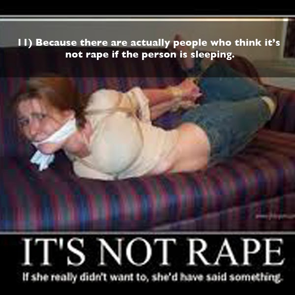 Il y a des gens déviants et malades qui pensent toutes sortes de crisse de niaiseries. Les opinions de ces hurluberlus constituent-ils une raison valide de percevoir tous les hommes comme des prédateurs potentiels? Je suis un homme et je comprends très bien le concept de consentement, je n'ai pas besoin d'un cours donné par des féministes pour faire de moi un être humain vertueux. Et, en passant, la photo représente fort probablement une femme consentante, en passant. Je ne prétends pas comprendre, mais il y a un paquet de gens (hommes ET femmes) qui prennent leur pied avec ce genre de truc.