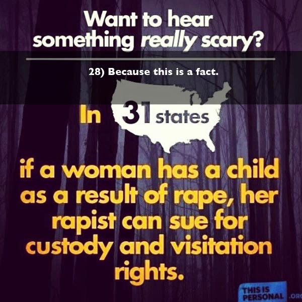 Croyez-vous vraiment que les politiciens ont fait des lois spécifiquement pour permettre aux violeurs de visiter les enfants de leurs victimes? Il faut vraiment être détraquée pour penser une chose pareille. Il s'agit sans doute de lois qui tentaient d'encadrer les droits des pères et qui ont oublié de prendre spécifiquement en compte les cas de viol. Il suffit d'amender la loi afin de réparer cet oubli, voilà tout. De toute façon, quel juge va accorder la garde des enfants à un type qui a été reconnu de violer leur mère? C'est du délire, une fois de plus. Les féministes se cherchent des raisons pour être en constant état de siège.