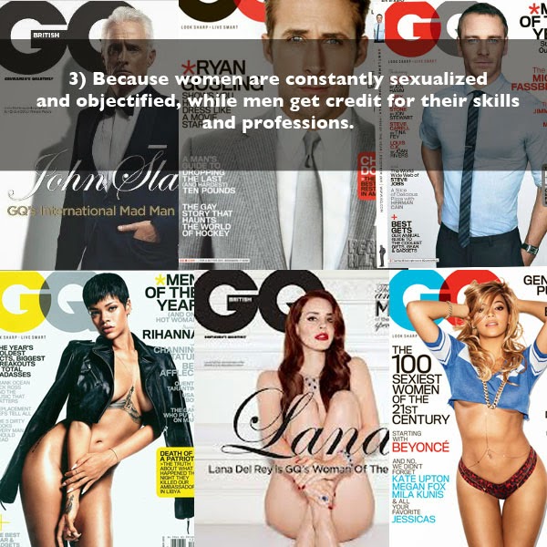 L'exemple qui est donné ici est risible. GQ est un magasine qui a comme clientèle les hommes hétérosexuels. De toute évidence, s'ils veulent vendre de la copie, ils vont donner à leurs lecteurs ce qu'ils souhaitent voir: des hommes à qui ils aimeraient ressembler et des jolies femmes sexy et dénudées. C'est la nature humaine ça, tout simplement, pas une "preuve" du "patriarcat". Cela étant dit, je n'ai jamais lu GQ de ma vie, ça me semble être de la pure merde et je suis un homme tout ce qu'il y a de plus hétéro. Il ne faut donc pas généraliser. Mais voilà, le féminisme ne fait que ça, généraliser.