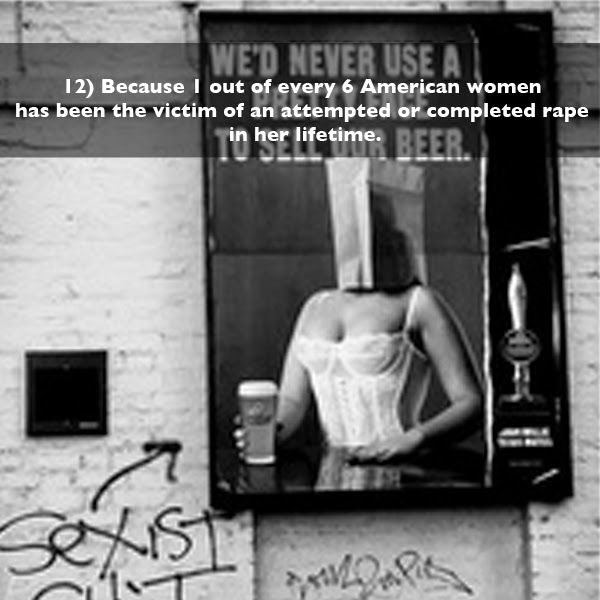 Trois choses me fatiguent à propos de celle-là. Premièrement, on peut faire dire bien des choses à des statistiques. Une Américaine sur six aurait été victime de viol? Si on parle de crimes où la culpabilité de l'agresseur a été prouvée, cela voudrait dire qu'environ le sixième de la population américaine mâle est en prison ou fichée à titre de prédateur sexuel. Autrement, on ne parle que d'allégations, et ça n'a alors aucune valeur. Deuxièmement, n'en déplaise aux féministes, les victimes de viol ne sont pas exclusivement de sexe féminin et le geste n'est pas moins horrible lorsque c'est un garçon qui le subit. Troisièmement, la photo qui accompagne le texte est une farce. Je la trouve d'ailleurs très drôle car elle démontre qu'il est possible pour une industrie de se moquer de ses propres pratiques. Mais qu'on rigole ou pas, le fait de tenter d'établir un lien entre le nombre de viols et une pub supposément sexiste est tout simplement idiot.
