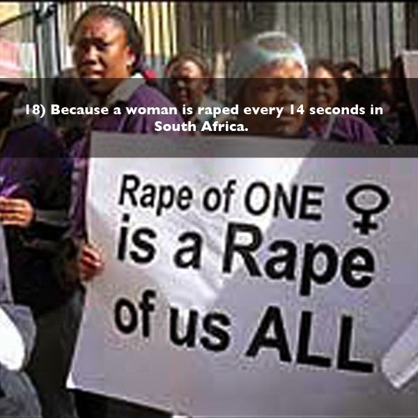 Je ne sais pas si c'est vrai en Afrique du sud, mais ça ne l'est certainement pas au Québec, alors l'argument est invalide ici. Si c'est vrai, alors c'est une bonne raison de s'indigner et de dénoncer depuis notre petit confort nord-américain, mais on n'a pas besoin d'être féministe pour ça.
